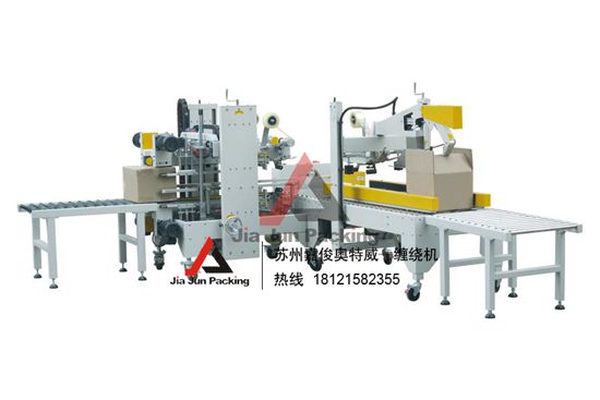 自動(dòng)折蓋封箱機(jī)與自動(dòng)四角邊封箱機(jī)聯(lián)機(jī)配套,組合成自動(dòng)工字型封箱