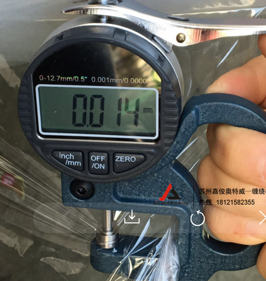 JSK專用膜采用優(yōu)質(zhì)的原材料和先進(jìn)的生產(chǎn)工藝,在達(dá)到機(jī)器需要的1:4的拉伸比要求的前提下,將膜的厚度降低到1.4絲,是市面?zhèn)鹘y(tǒng)機(jī)用纏繞膜的1/3左右,即同樣1KG膜,JSK專用膜的長度是傳統(tǒng)纏繞膜的2.5倍以上。