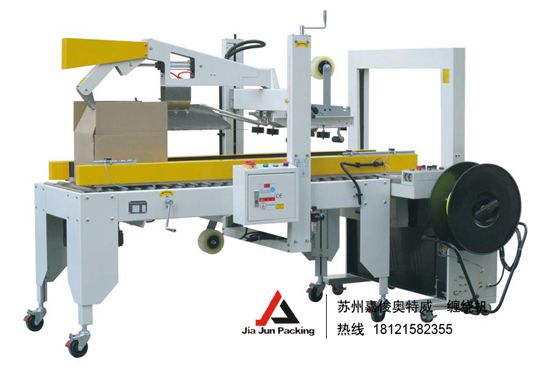 自動折蓋封箱打包機,機器尺寸L2460×W1420×H1650,機器輸送速度6箱每分鐘。嘉俊奧特威除了打包機,還有纏繞機封箱機等機器生產(chǎn)出售。