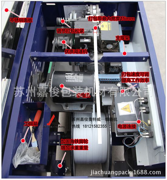 此款半自動(dòng)打包機(jī)對(duì)打包帶的要求廣泛,厚度(0.55-1.2)mm,寬度(9-15)mm,同樣重量的帶子我們可以做到很薄,帶子更長(zhǎng),打包數(shù)更多;可比現(xiàn)有的市場(chǎng)上機(jī)器包帶成本降低30-50%。嘉俊另有纏繞機(jī)、碼垛機(jī)、封箱機(jī)。